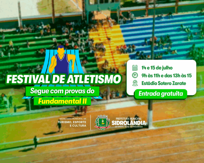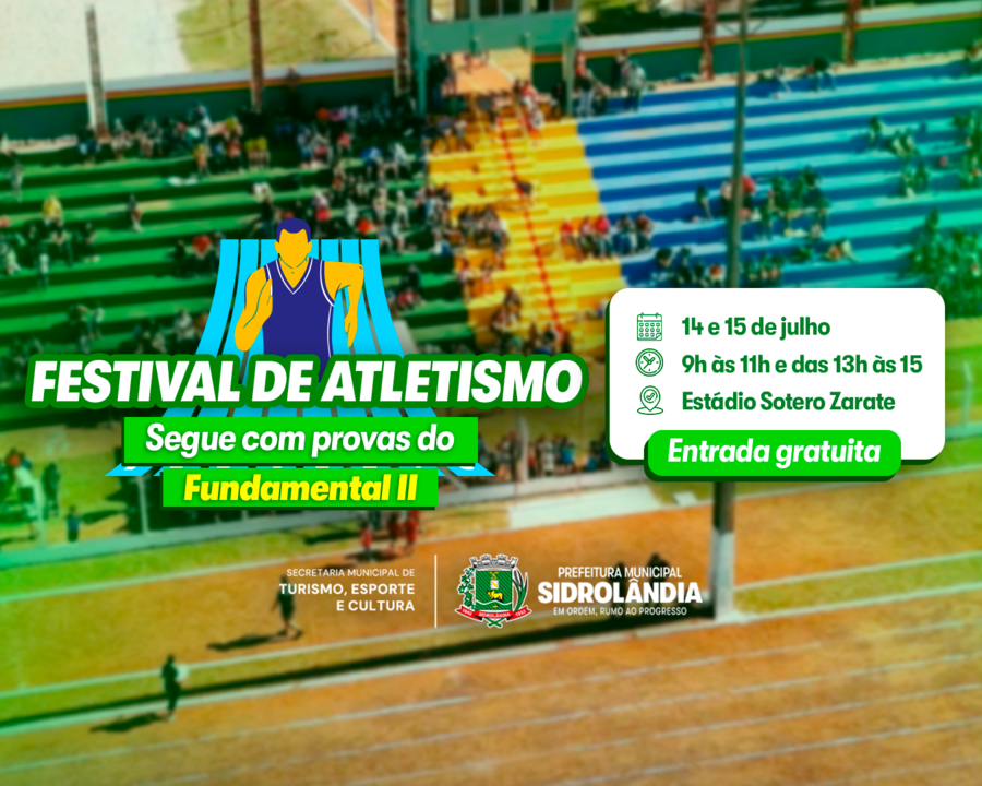 Prefeitura de Sidrolândia, por meio da Secretaria de Turismo, Esporte e Cultura e da Secretaria Municipal de Educação, realizará nos dias 14 e 15 de julho a segunda etapa do 1º Festival Escolar de Atletismo, agora com a participação dos estudantes do Ensino Fundamental II das redes municipal, estadual e particular de ensino.